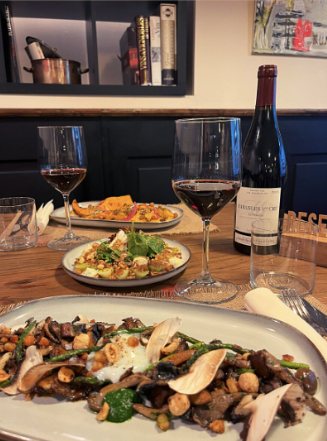 Al principio, solo paramos a tomar algo, pero no pudimos resistirnos a pedir una tabla de quesos para acompañar nuestro vino francés, junto con un delicioso paté envuelto en hojaldre. ¡Todo estaba buenísimo! ¡Volveremos para goner algún día!