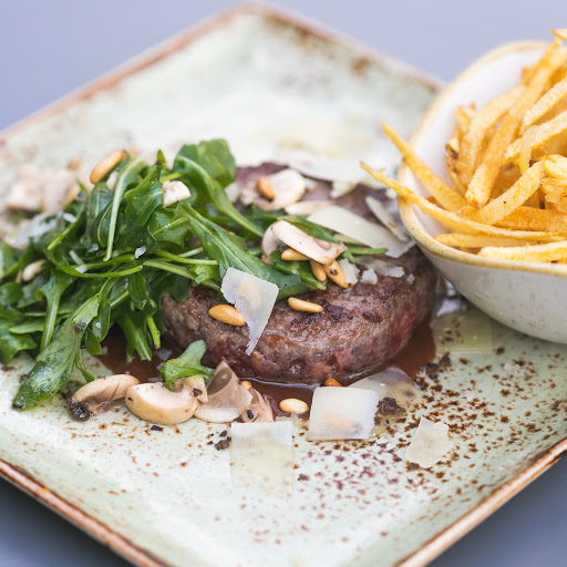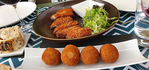 Establecimiento moderno con tuberías a la vista y terraza con jardín que sirve cocina mediterránea de mercado.