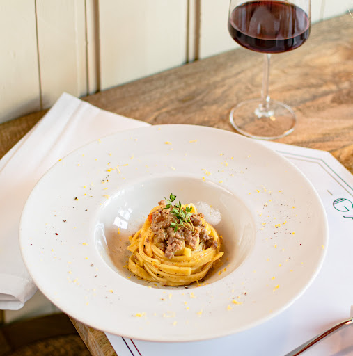¡Guau, qué comida tan fantástica tuvimos aquí! Tanto la comida como el vino fueron exquisitos. Empezamos con gorgonzola con higos, miel y nueces, y ya era una delicia. Pedí una pasta especial con pecorino, guanciale, pimienta y fingerlings, ¡guau! Mi novia pidió la lasaña, y también estaba fantástica. Después de tanta comida deliciosa, aún hicimos espacio para el postre porque nos dejó con ganas de más. Pedí una especie de empanada con queso y miel, y mi novia pidió el tiramisú (la receta de su madre). La verdad es que hacía tiempo que no comíamos tan bien. Además, el anfitrión fue increíblemente amable y atento. ¡Qué lugar tan fantástico!