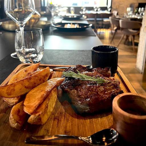 La carne está buena y está en su punto. El chorizo muy sabroso, no así la empanadilla de carne que está sosa e insipida. Las patatas fritas no me han gustado y las verduras asadas tampoco: el calabacín está amargo y la berenjena medio cruda e insipida. Las mesas altas tienen los taburetes muy bajos, y parece que estás asomado a una barandilla para comer, es muy incómodo. Los aseos de aspecto todo negro y con poca luz más bien parecen una cueva, están un tanto descuidados y con mal olor.