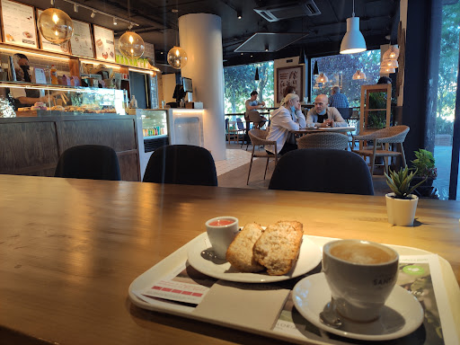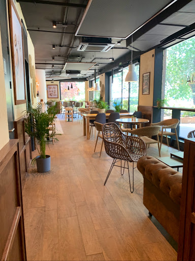 Cafetería amplia y limpia, hay mucha variedad de opciones para elegir tanto bollería como tipos de leches, cafés y tés. El café ecológico está muy bueno, las chicas que atienden son muy agradables y rápidas, aunque es cierto que únicamente tienen una caja, por lo que aunque sean rápidas, suele haber cola a las horas puntuales.